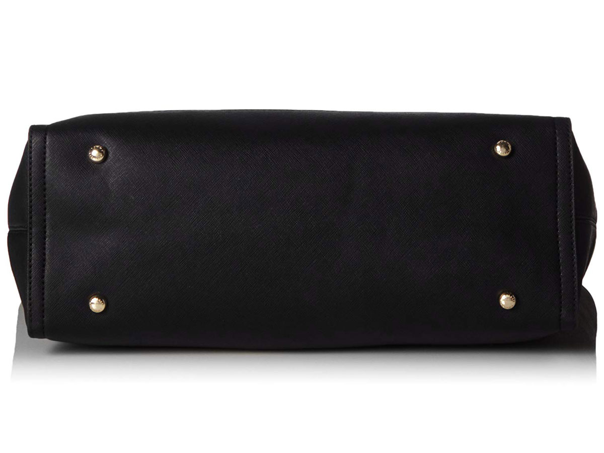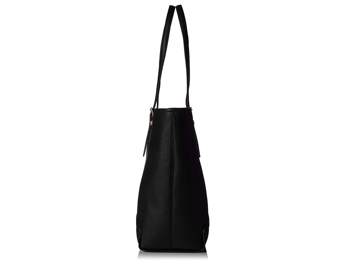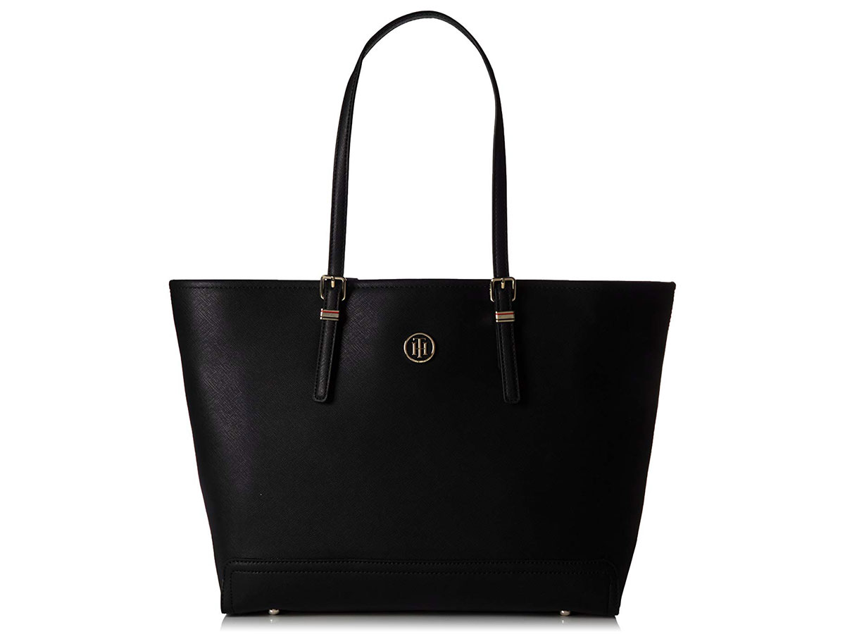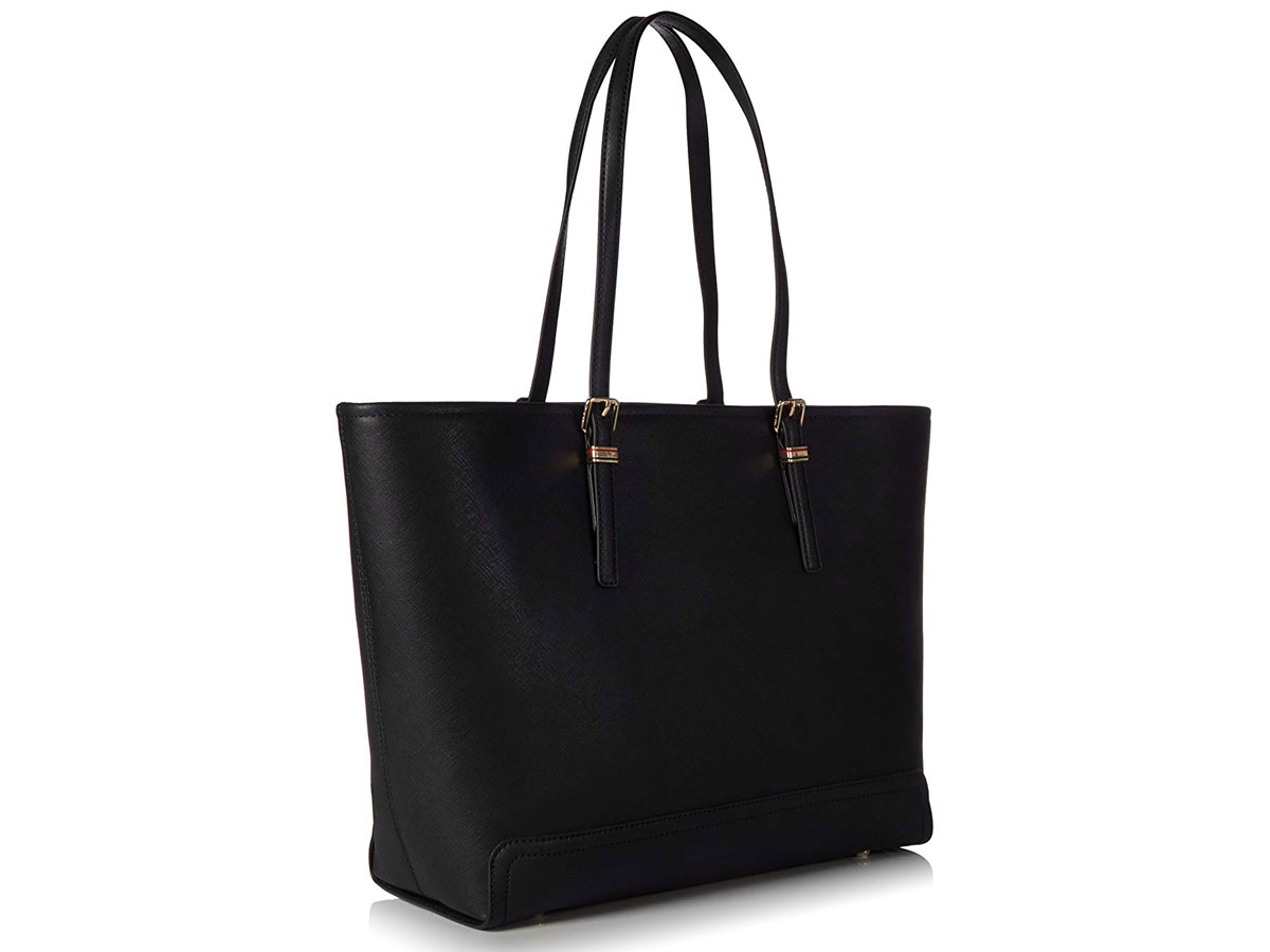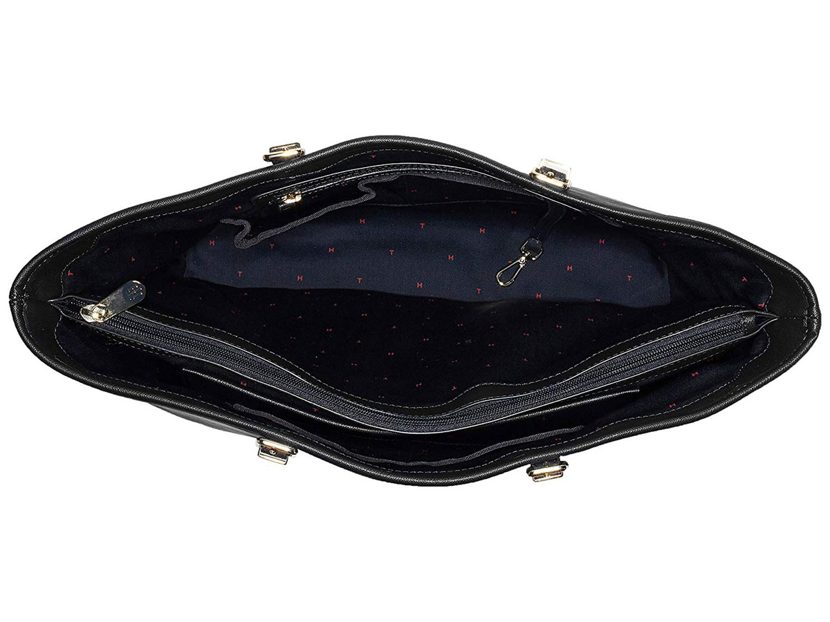 De laptoptas is gemaakt van zwart Saffiano leder en heeft een voor Tommy Hilfiger kenmerkende donkerblauwe voering. Centraal in de laptoptote zit het laptopvak dat met een ritss afsluitbaar is. Aan beide zijden van dit centrale vak is veel ruimte, een ritsvakje en meerdere kleine organiser vakjes.