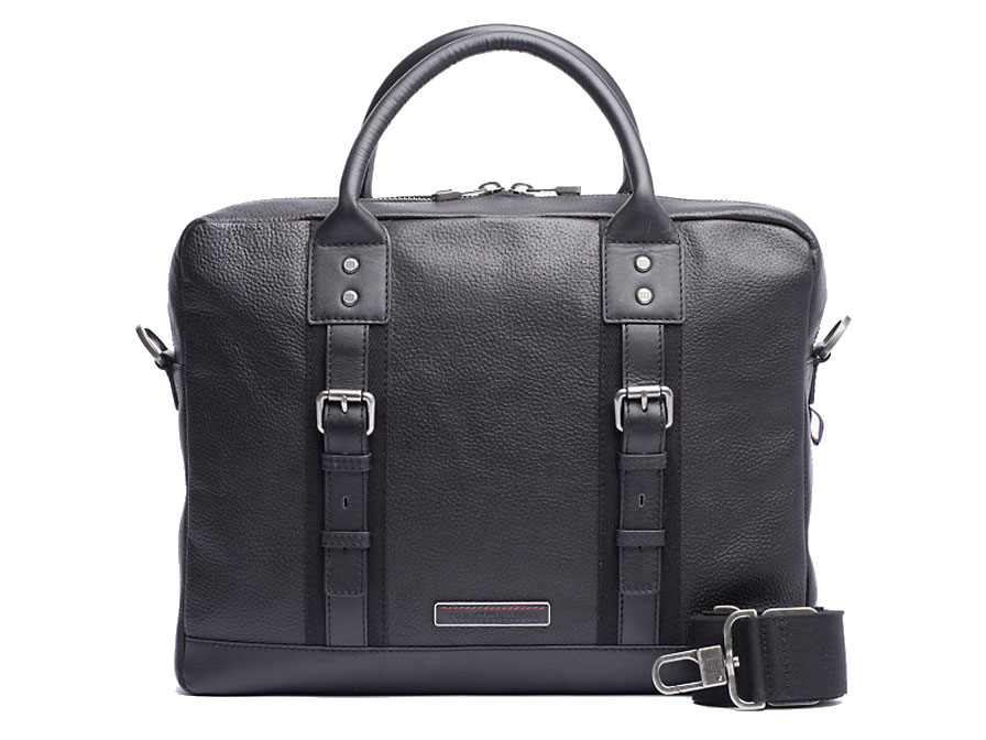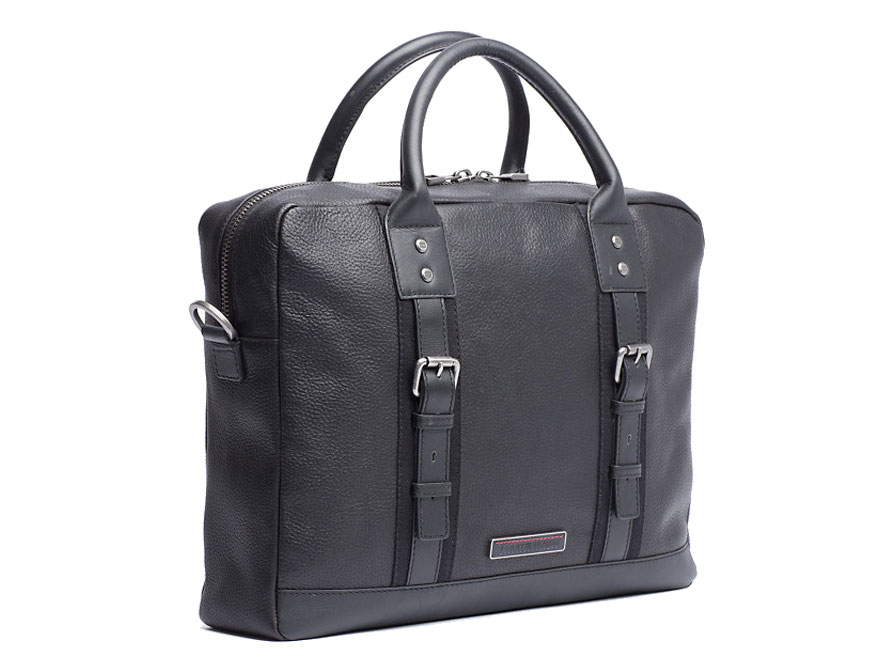 Deze Tommy Hilfiger laptoptas draagt de naam Tiago. Het is een stoer ontworpen laptop briefcase, gemaakt van echt leder met fraaie details, zoals de dubbele gespen voorop en zilveren metalen hardware. Het Tommy Hilfiger logo is subtiel in zwart onderaan de tas aangebracht.