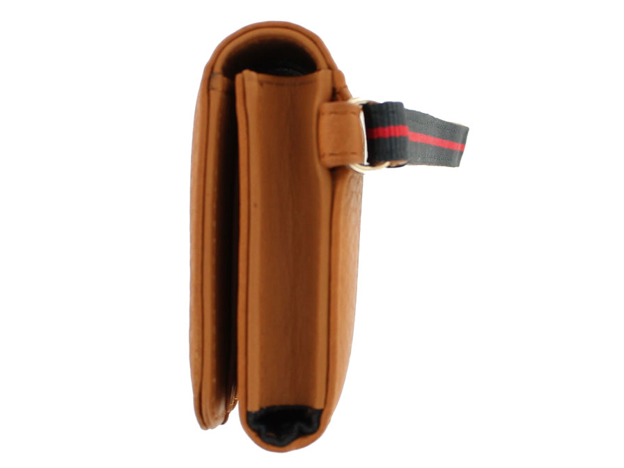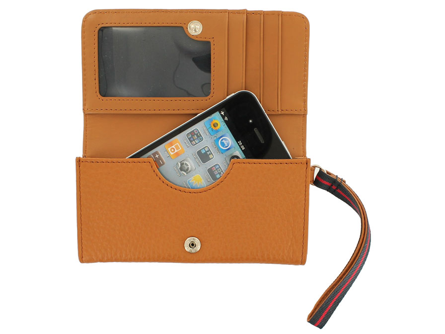 Binnenin de pouch is een op maat gemaakt vakje waar de telefoon in opgeborgen kan worden. Daarnaast is er ruimte voor pasjes, pasfoto's, visitekaartjes en papiergeld.