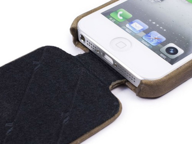De iPhone SE/5s/5 klikt eenvoudig vast in de case. Hierbij blijft het scherm volledig vrij voor een optimaal bedieningsgemak. De case kan vervolgens dicht worden geklapt zodat de iPhone SE/5s/5 volledig rondom beschemd wordt. De binnenzijde van de case is afgewerkt met zacht materiaal om krassen op de iPhone 4/4S te voorkomen.