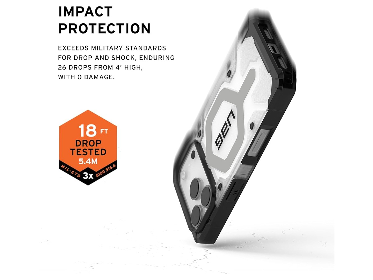 Laat je niet misleiden door het slanke profiel. De Urban Armor Gear Pathfinder Clear iPhone 17 Pro case is uitgerust met een vederlichte armor-shell en een slagvast frame. De kern met innovatief HEX patroon absorbeert schokken bij impact, terwijl de verhoogde randen rondom het scherm je display beschermen tegen krassen en barsten bij een val. Voor extra veiligheid zijn de hoeken verdikt en van schokabsorberend, onbreekbaar TPU materiaal dat vallen van grote hoogte moeiteloos kan opvangen.