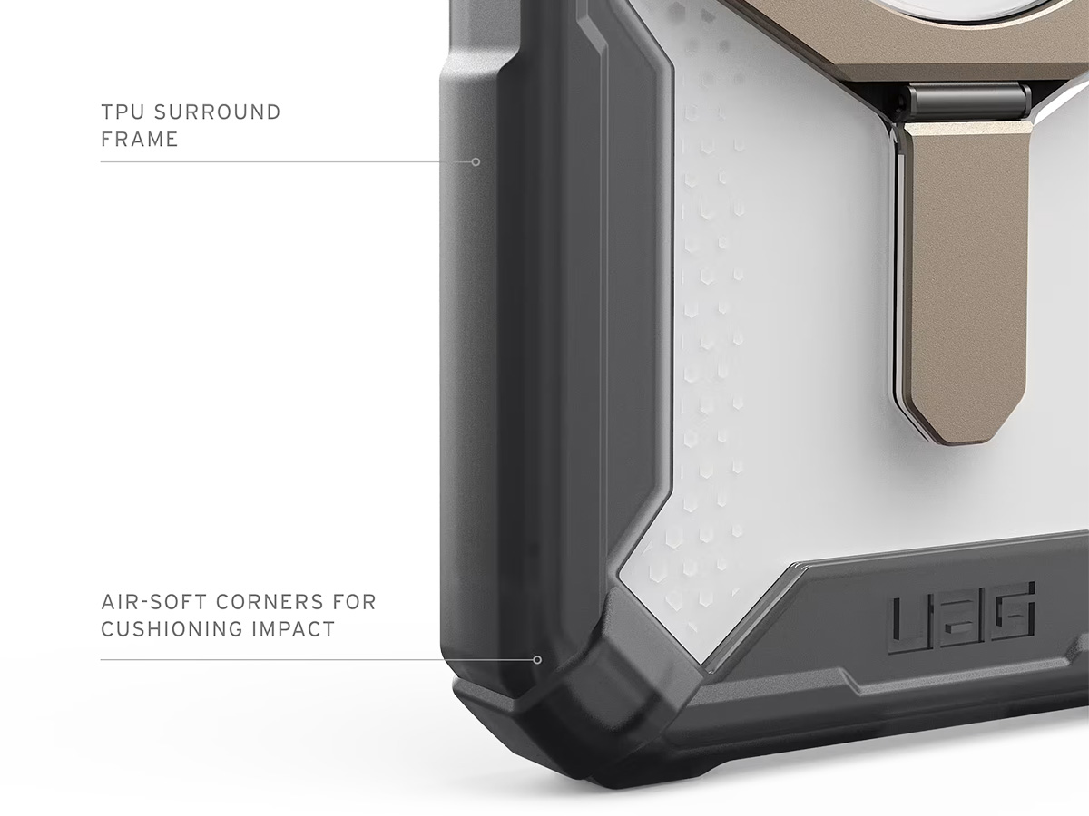 De ingebouwde metalen kickstand maakt handsfree gebruik eenvoudig. Ideaal voor het kijken van video’s, videobellen of het gebruiken van uw Apple iPhone 17e/16e in zowel portret- als landschapsmodus. Dit maakt de Urban Armor Gear Plasma XTE bijzonder geschikt voor werk, reizen en entertainment.
