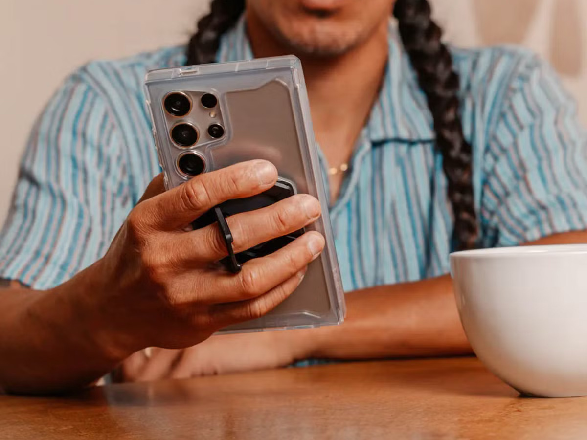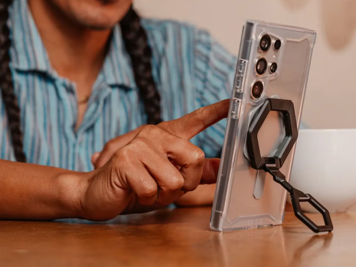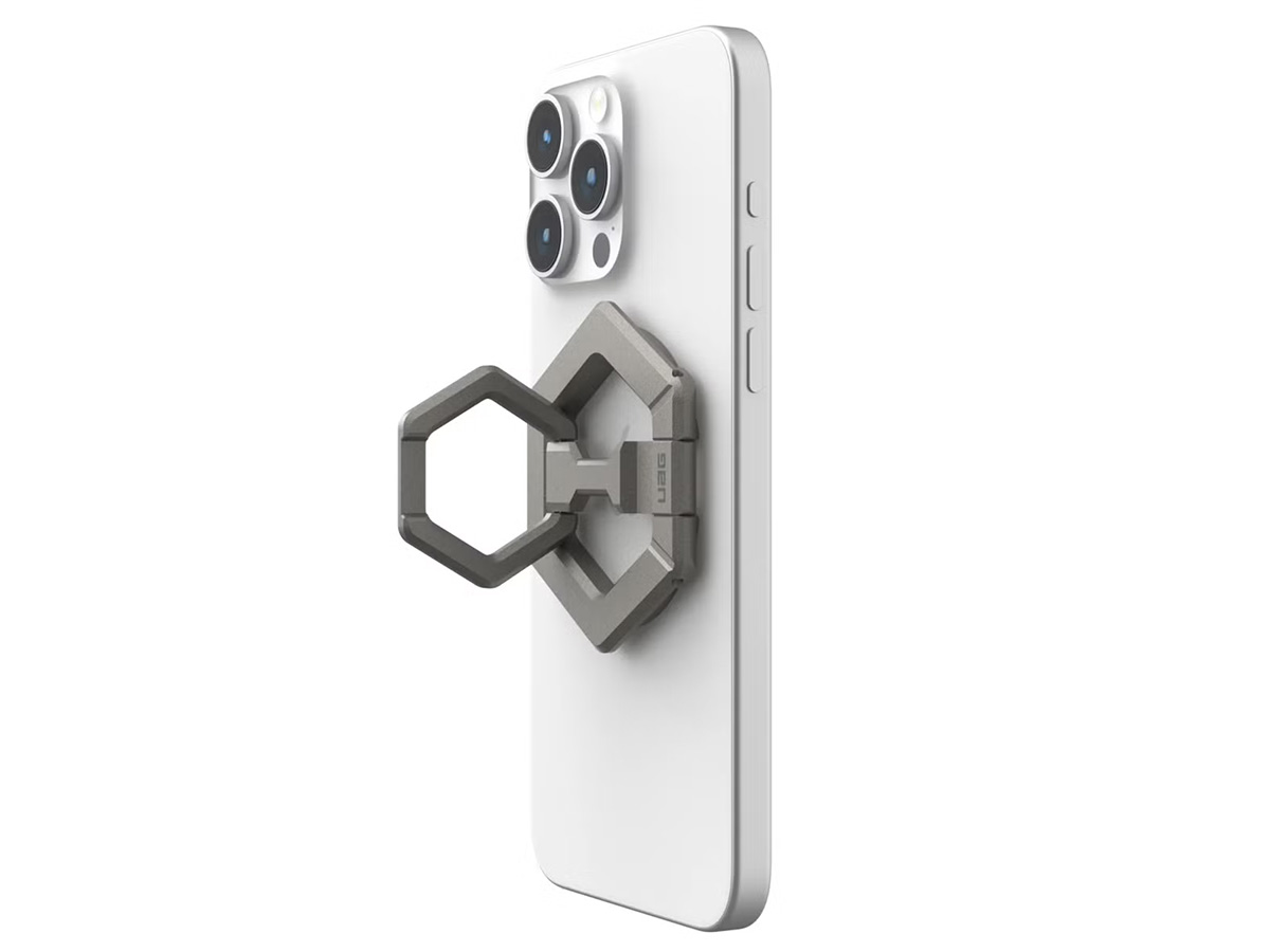 De UAG Magnetic Ring Stand klikt moeiteloos vast op Qi2 en MagSafe-compatibele toestellen en hoesjes. De krachtige magneten zorgen voor een betrouwbare bevestiging, zodat het accessoire goed op zijn plaats blijft zitten tijdens gebruik.