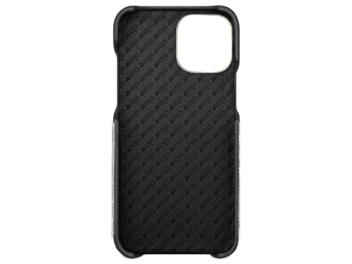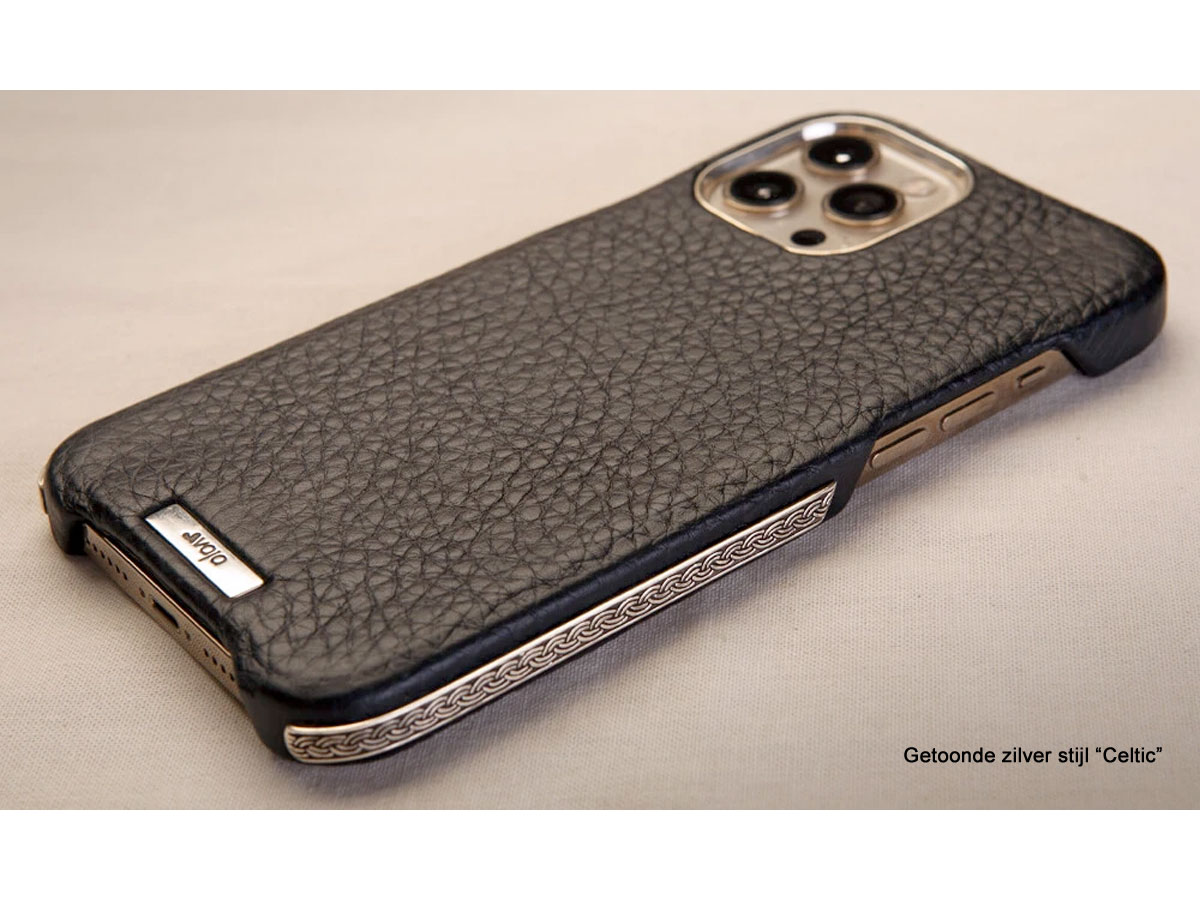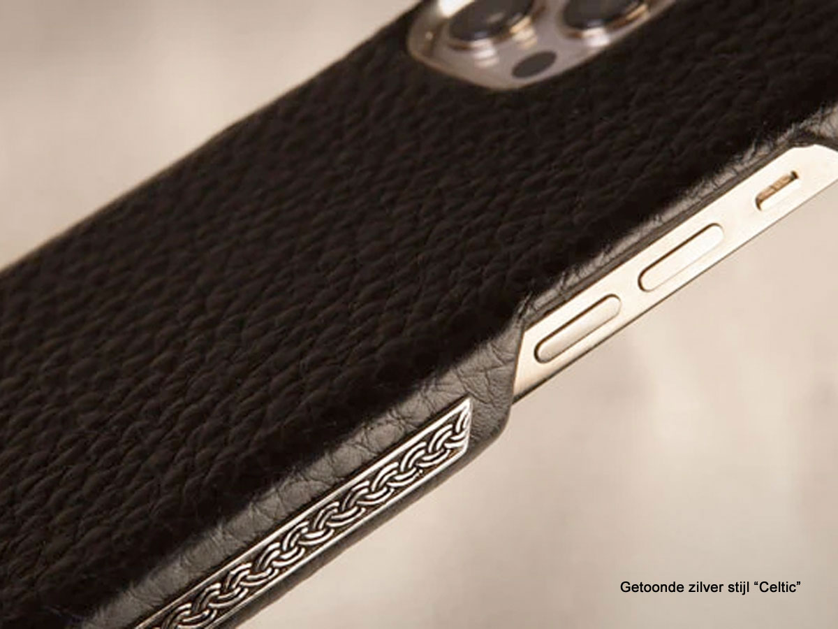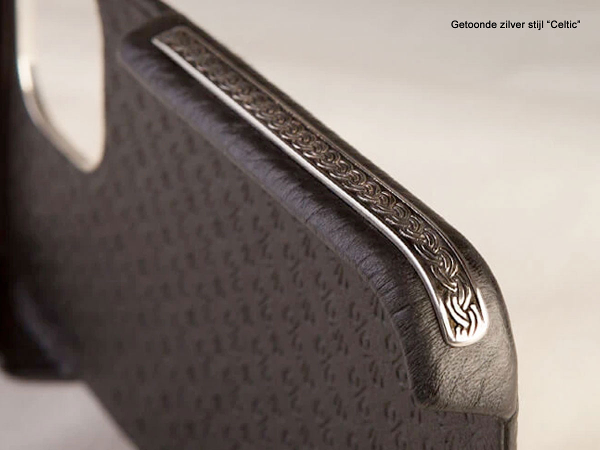 Deze unieke Vaja case voor iPhone 13 Pro Max is rondom voorzien van details die in .925 zilver zijn uitgevoerd: de Vaja logo's, de rand rond de camera en de gedecoreerde rand op de zijkant, waarbij u keuze heeft uit verschillende stijlen. Bij deze uitvoering is gekozen voor de "Valiant" afwerking.