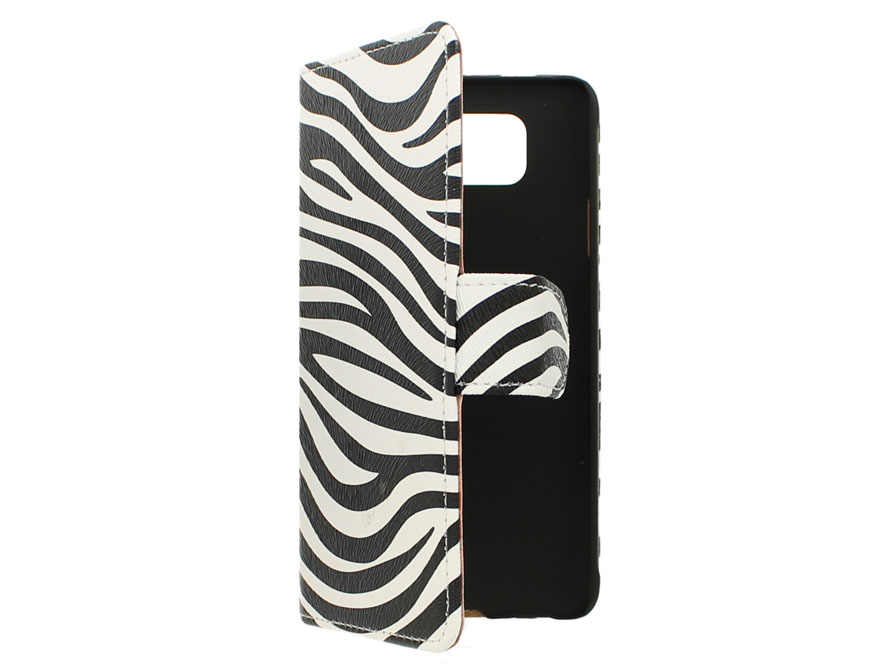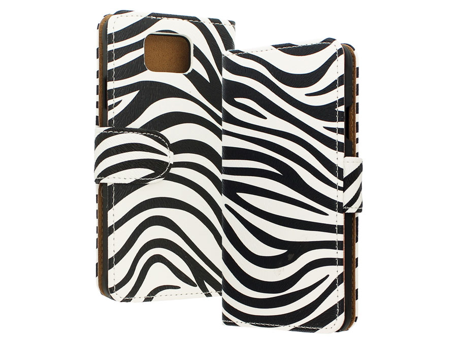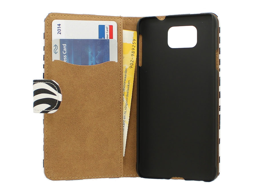Deze kunstleren book-case is speciaal ontworpen voor de Samsung Galaxy Alpha (G850F). Het hoesje is gemaakt van kunstleer met een hip zebra motief. Binnenin de case is er plek om pasjes op te bergen.